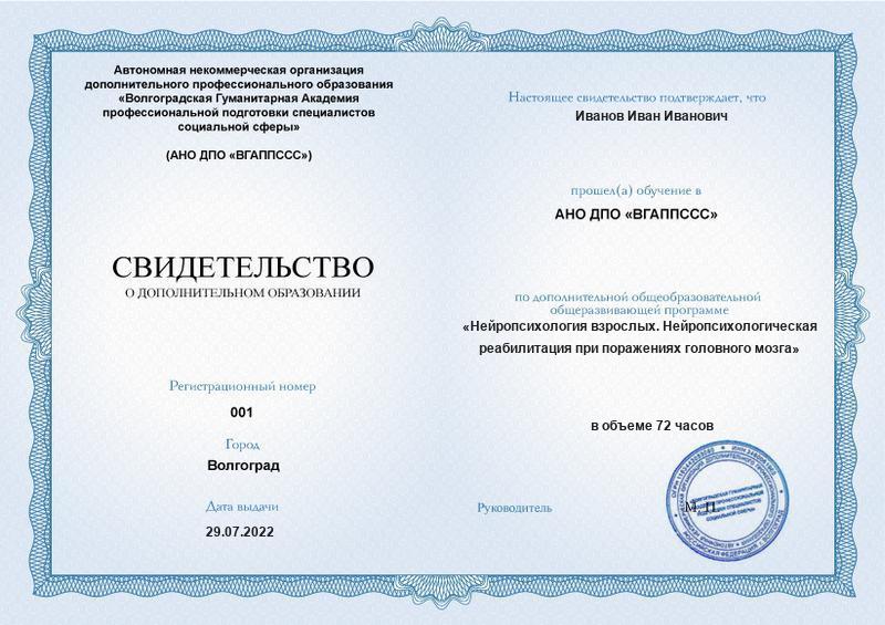 Учебный план дополнительной общеобразовательной программы «Нейропсихология взрослых. Нейропсихологическая реабилитация при поражениях головного мозга»